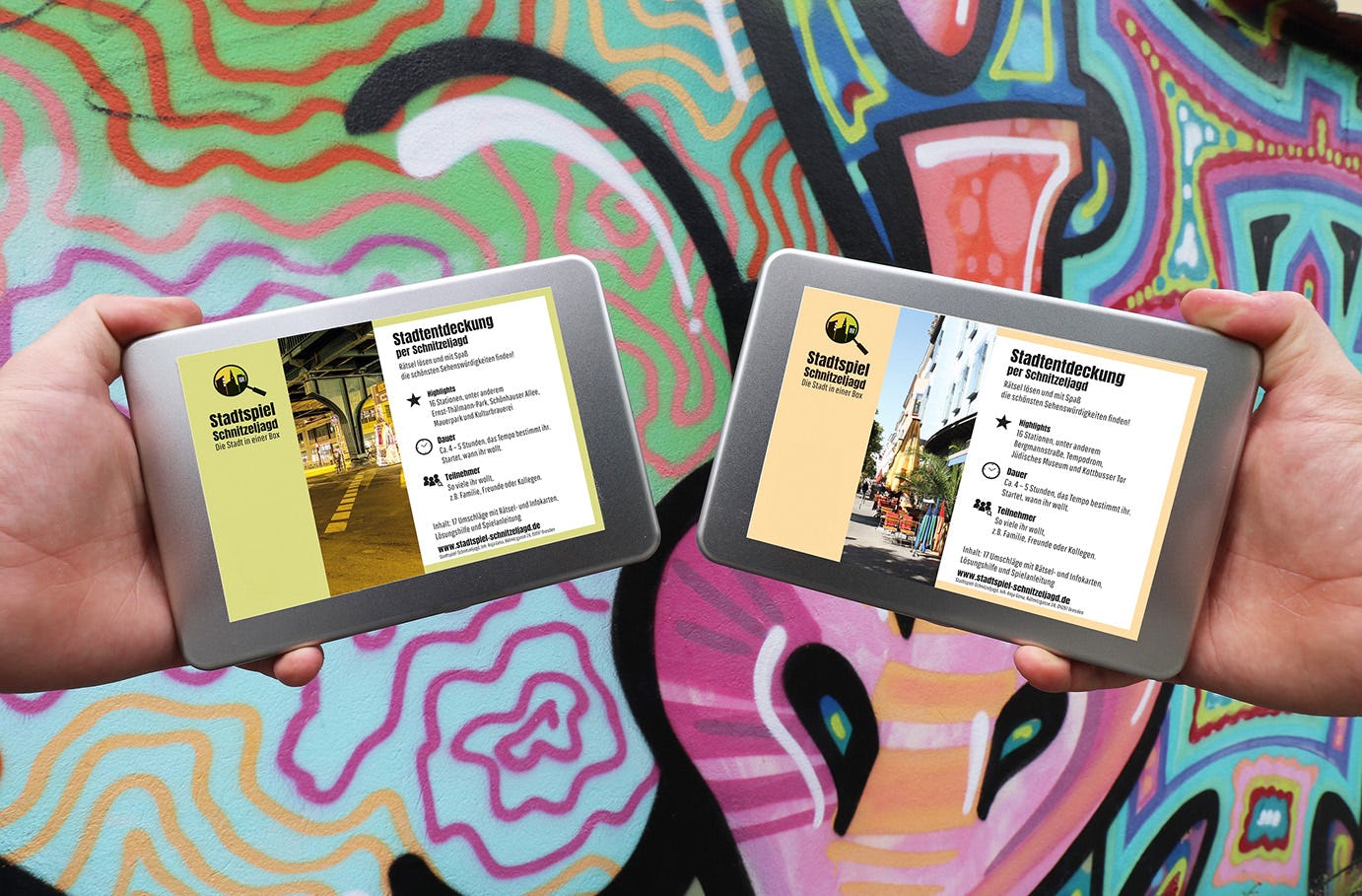 - Schnitzeljagd in Form einer Stadtspiel-Box in edler Geschenkverpackung aus Metall für mehrere Personen