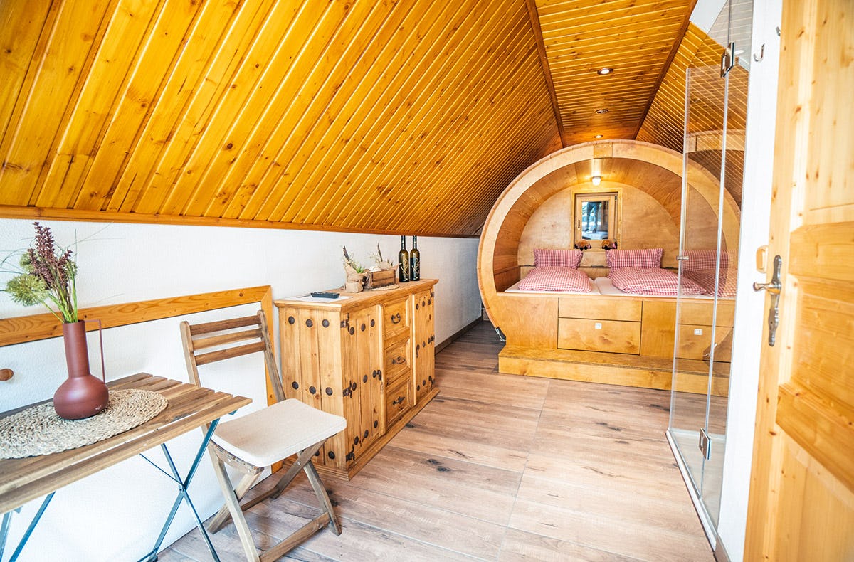 Erlebt außergewöhnliche Nächte im Weinfass-Chalet auf dem Winzerhof Küssler. Genießt Weinverkostungen, Candle-Light-Dinner und mehr!
